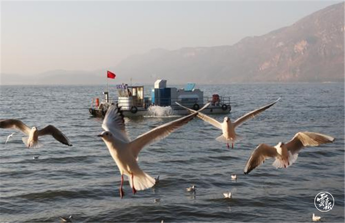 清晨时分,海鸥飞翔的昆明海埂公园滇池水域,一艘“绿色治藻”作业船正在进行水面例行巡航除藻。
