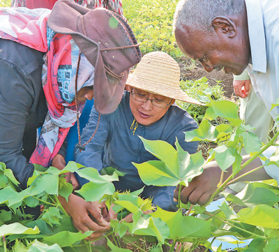 中方专家在田间向苏丹棉农传授经验。援苏丹农业技术示范中心供图