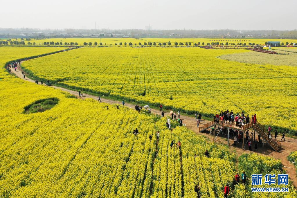 3月28日,游客在宝丰县龙王沟乡村振兴示范区的油菜花田中赏花(无人机照片)。新华社发(何五昌/摄)
