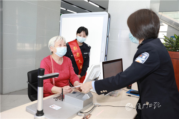 2、陪伴服务全流程。厦门出入境加强出入境办证大厅自助设备人工引导服务,设置党员先锋岗,安排党员民警为没有亲属陪伴的老年人提供一对一全流程陪伴式服务,为使用智能自助设备有困难的老年人提供全流程引导办理,方便老年人享有智能化服务。