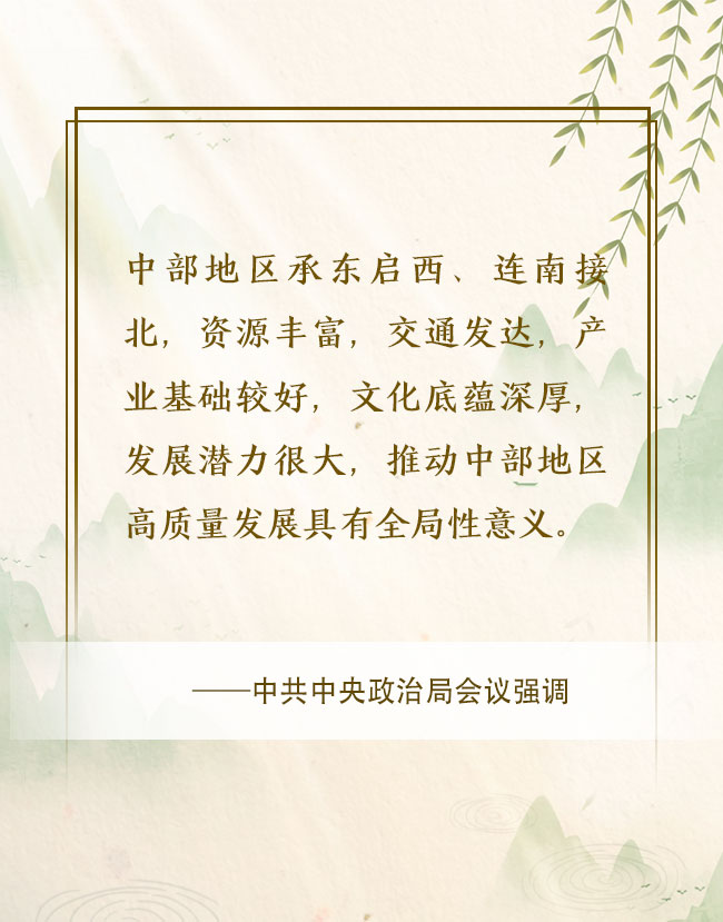 3月30日,习近平总书记主持中共中央政治局会议,审议《关于新时代推动中部地区高质量发展的指导意见》,为新时代中部地区高质量发展指明方向。会议强调,要推动中部地区加快崛起,在全面建设社会主义现代化国家新征程中作出更大贡献。