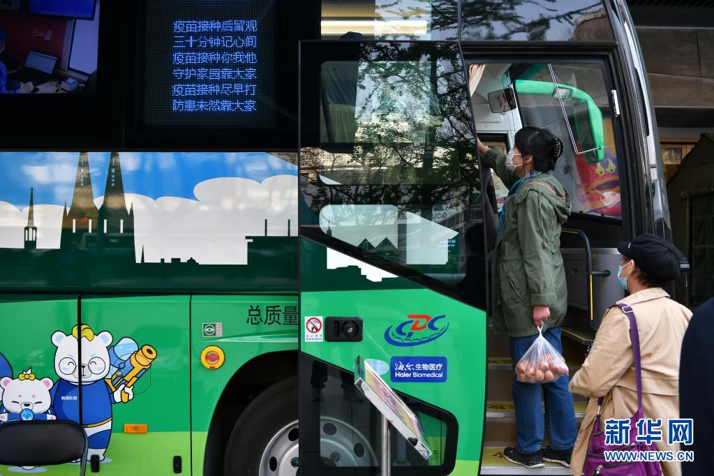 4月7日,市民从移动疫苗接种车的前门进入准备接种疫苗。新华社记者 李鑫 摄