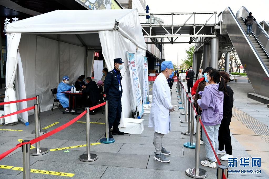 4月7日,市民在北京西单商业区设立的疫苗接种点排队接种疫苗。新华社记者 李鑫 摄