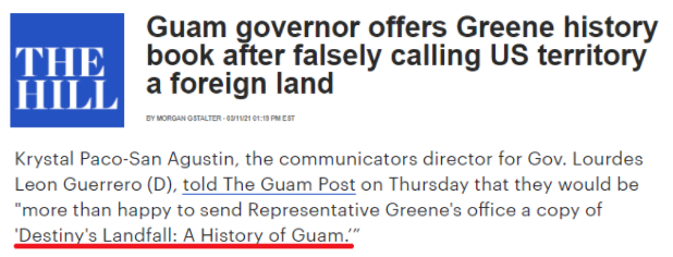 更令人难以忍受的是一些政客的无知妄言。不久前,美国佐治亚州共和党籍联邦众议员马乔里·泰勒·格林在一次公开演讲中,竟然错误地把关岛说成是一个不应该接受美国财政援助的“外国”。