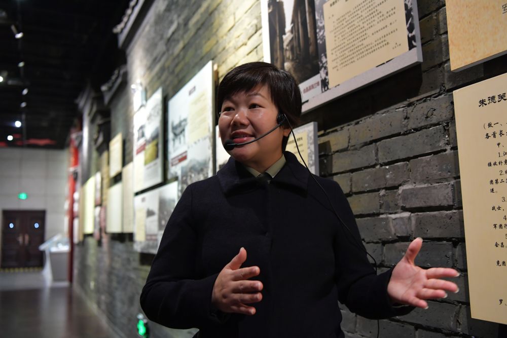 在中央红军长征出发纪念馆,副馆长钟敏正在给参观的游客介绍长征的历史(4月6日摄)。新华社记者 彭昭之 摄