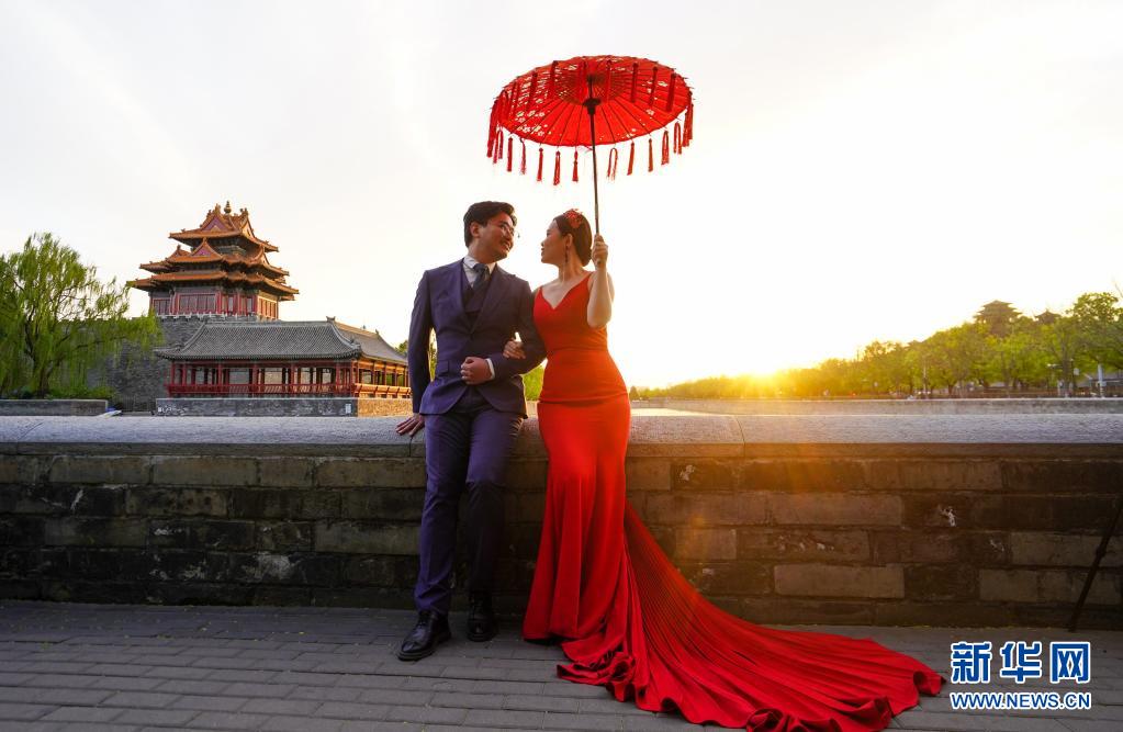 4月12日,一对新人在夕阳下的故宫角楼附近拍摄婚纱照。新华社记者 陈晔华 摄