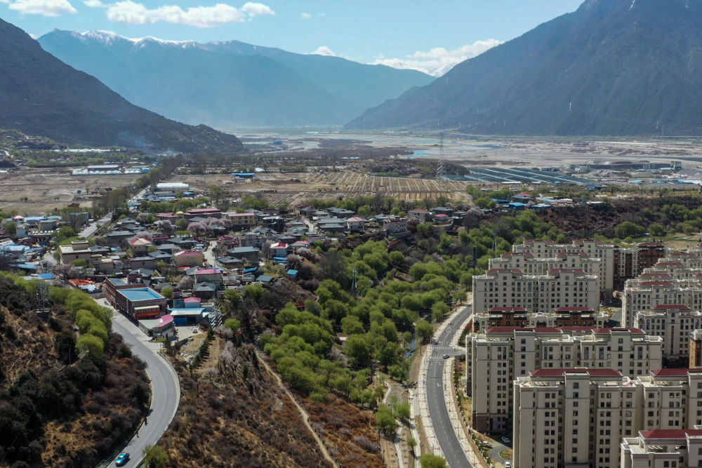 这是西藏林芝巴吉村(画面左侧)及毗邻的八一镇(2021年4月6日摄,无人机照片)。新华社记者 洛卓嘉措 摄