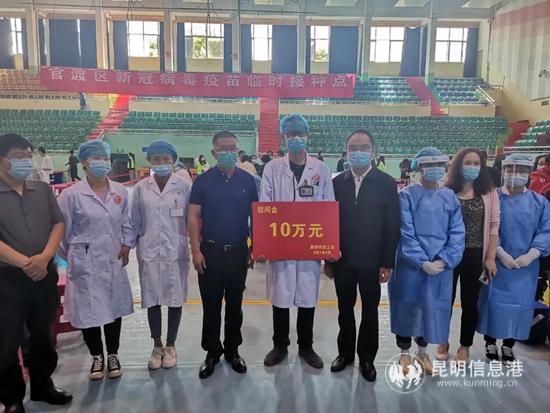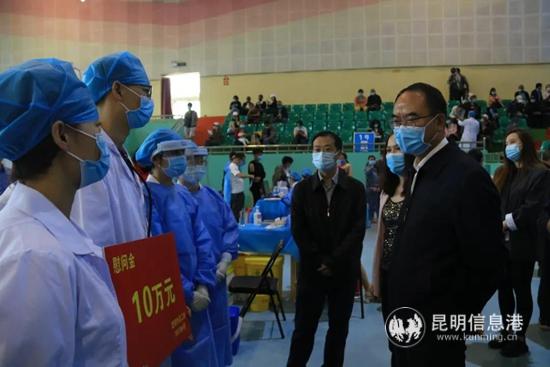 昆明信息港讯 4月29日上午,在“五一”国际劳动节来临之际,受市委、市政府的委托,昆明市总工会党组书记、主席戚永宏率慰问组,到昆明市官渡区体育馆新冠疫苗接种点进行慰问,向坚守在工作岗位上的防疫一线职工致以节日的问候和祝福,并送上慰问金,将党和政府的关心关爱、工会组织的温暖关怀送到职工心坎上。