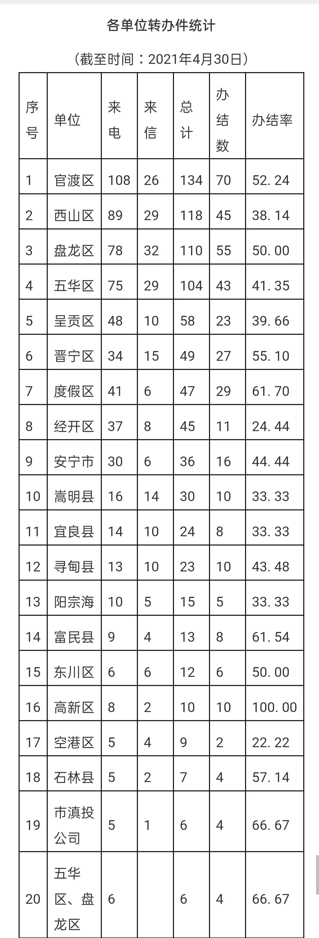 截至4月30日,昆明市共收到中央督察组交办群众举报投诉问题24批次907件,办结412件,办结率为45.42%。(昆明市生态环境保护督察办公室)