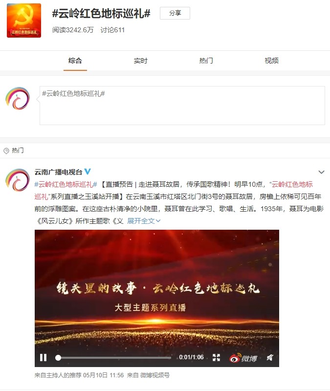 截至目前,本场直播观看量过145万,单场直播阅读量1407万,总阅读量3407万。其中,“云岭红色地标巡礼”微博话题阅读量3242.6万,@云南日报、@云南网、@北京电视台、@云南信息报、@昆明信息港、@昆明日报掌上春城、@保山日报、@都市现场、@中国网政视频等媒体,以及中共云南省委政法委员会@云南政法、昆明市防震减灾局@昆明防震、昆明市五华区委区政府@昆明五华发布、@昆明市五华区总工会官微、开远市融媒体中心官方微博@美丽开远、昆明市西山区政府官方微博@昆明市西山区发布等媒体和机构积极参与话题互动讨论。