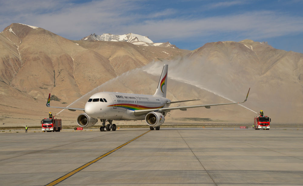 2020年7月1日,阿里昆莎机场通航10周年,飞机穿过水门。新华社记者田金文摄