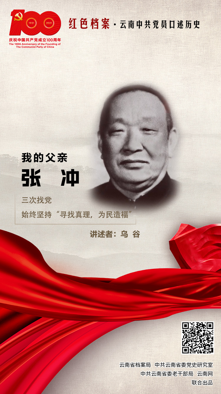 “见到了叶剑英后正式向他提出加入中国共产党……”回忆起父亲张冲寻找中国共产党的故事,乌谷先生感触颇深。讲述人乌谷先生为张冲将军长子,曾任云南省民委古籍办公室主任,主持整理、编译了大量云南少数民族史诗、传说,为云南民族文化的保存整理作出了重要贡献。
