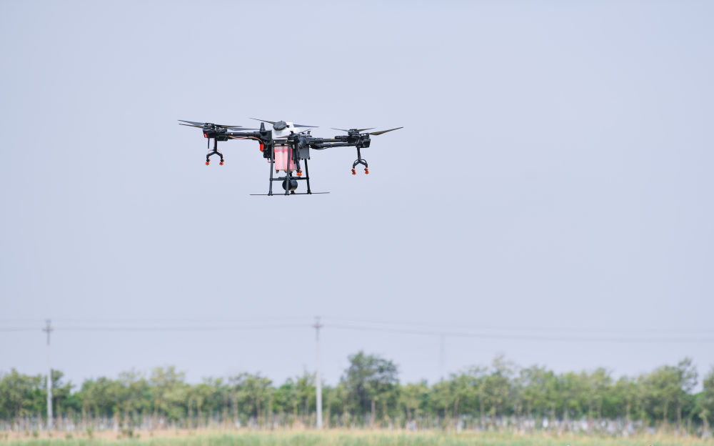 ↑在天津市西青区王稳庄镇,植保无人机进行除草剂喷洒作业(5月11日摄)。新华社发(孙凡越摄)