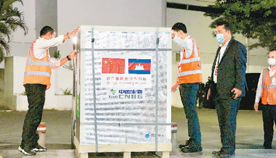 3月31日,工作人员在柬埔寨金边国际机场搬运中国援柬新冠疫苗。