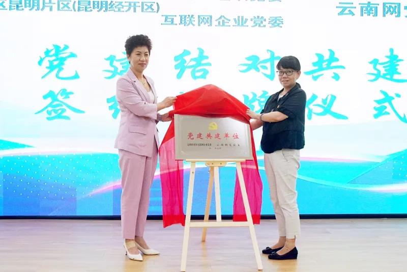在党建结对共建签约揭牌仪式上,区“两新”组织党委书记李建华与云南网党总支书记、总编辑刘红签订了党建结对共建协议书;何云虹与刘红共同为昆明经开区互联网企业党委、云南网党总支党建共建单位揭牌。