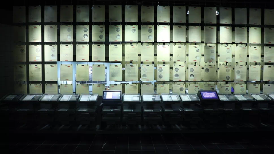 侵华日军第七三一部队罪证陈列馆人体实验展区,一张张英文人体实验报告书复印件,连成一面墙。新华社记者何山摄