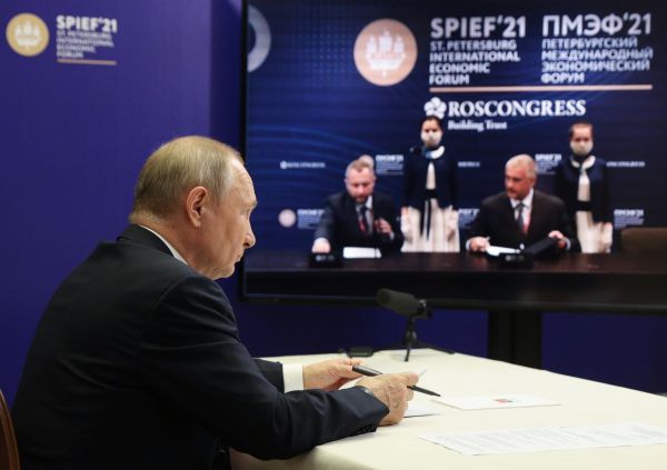 普京(左)3日通过视频出席圣彼得堡国际经济论坛活动(俄罗斯卫星社)