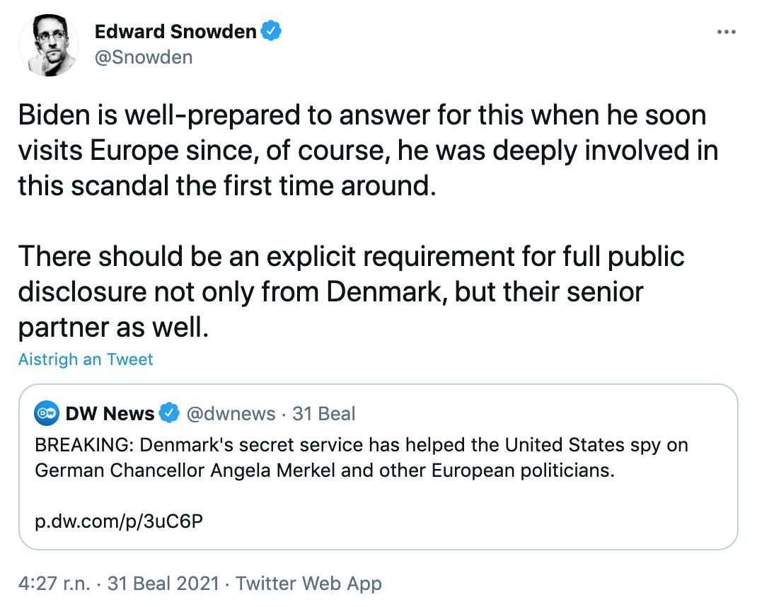 而在斯诺登看来,拜登已经为在不久后的欧洲之行中如何回应这一话题,做了充分的准备。