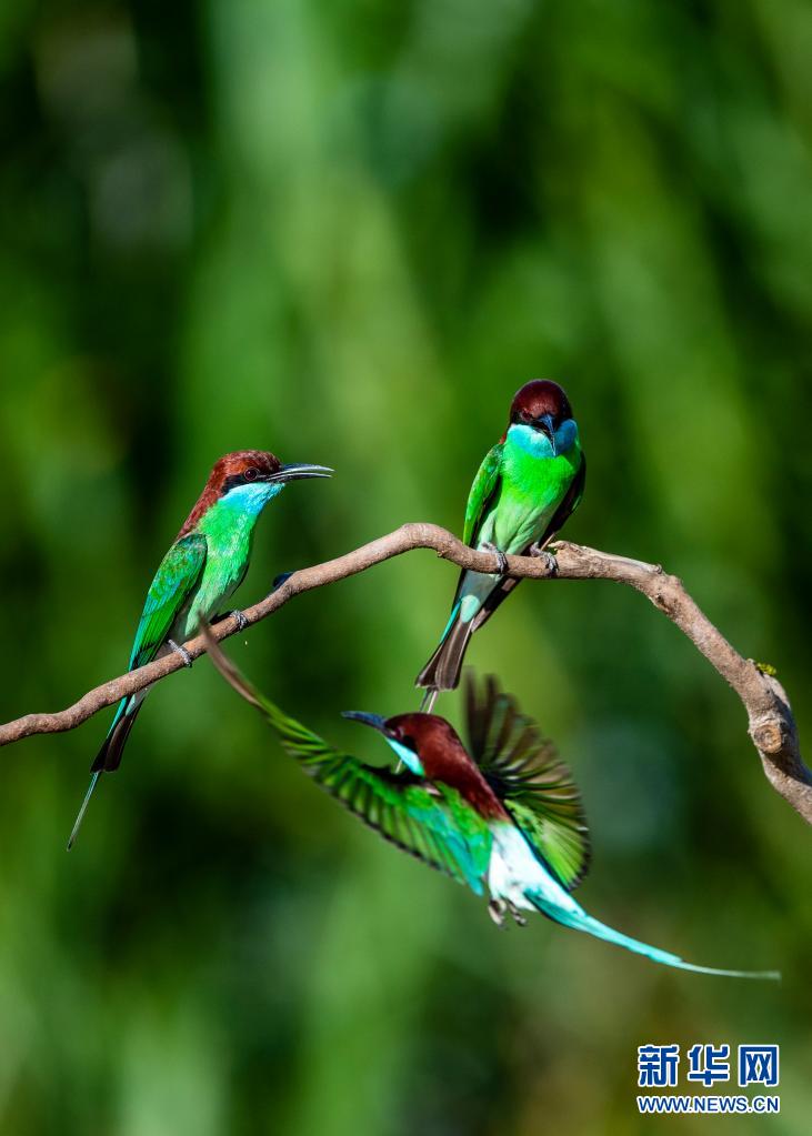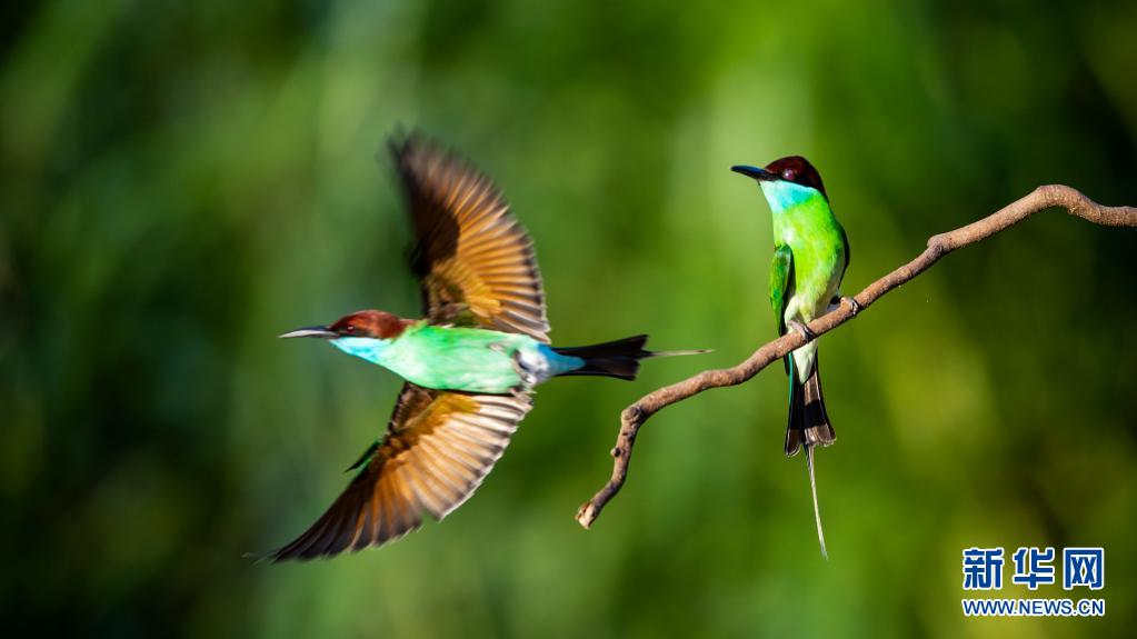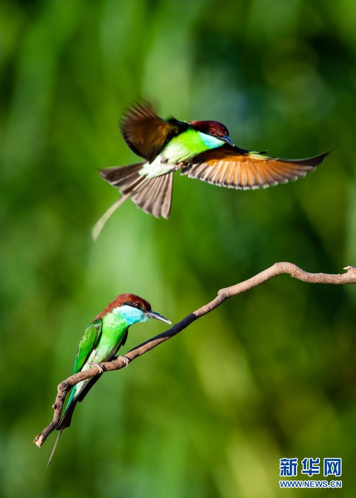 5月26日,蓝喉蜂虎在南平市延平区炉下镇斜溪村闽江河谷嬉戏。新华社记者 梅永存 摄