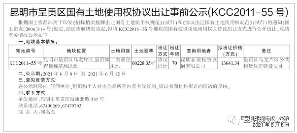 6月8日,昆明市呈贡区人民政府发布“昆明市呈贡区国有土地使用权协议出让事前公示(KCC2011-55号)地块”,公示显示,该地块将用于建设公共租赁住房项目。