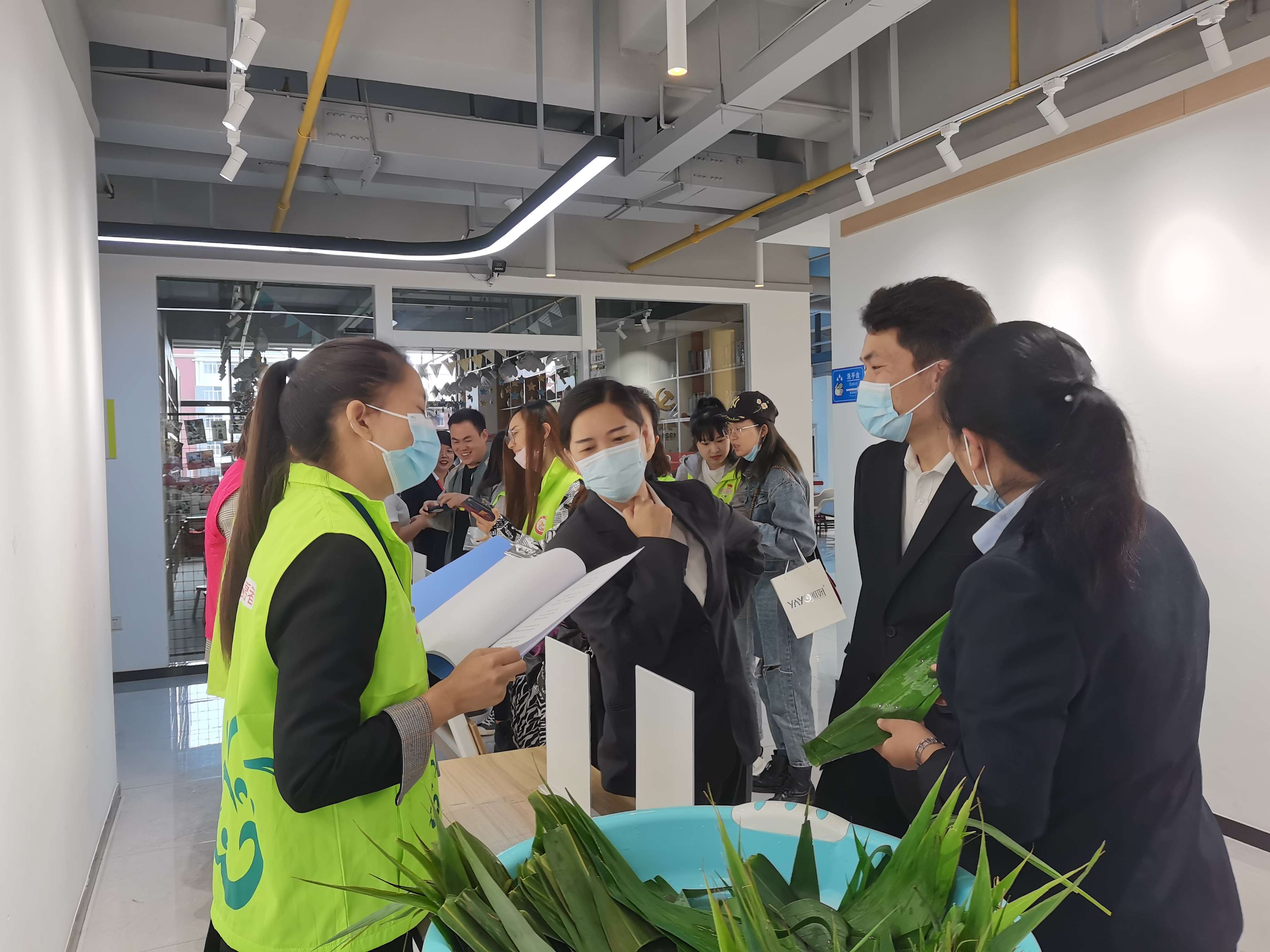 当然在现场最热闹的还是要数“包粽子”环节了,居民们将提前准备好的盆、锅、剪刀、等工具整齐地摆放在桌子上。折粽叶、舀糯米、放蜜枣、放葡萄干.....在社区志愿者们的带领下,大家熟练的做着卷、放、压、收、合的动作,一双双灵巧的手把自己对生活的热爱全都包进了甜甜的粽子里,浓浓的节日气氛也拉近了社区居民们的心。