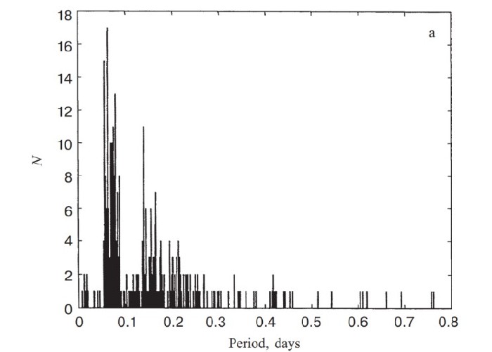 图5. 激变变星的观测轨道周期分布 (图源:Katysheva, et al., Astrophysics, 2003, 46, 114)