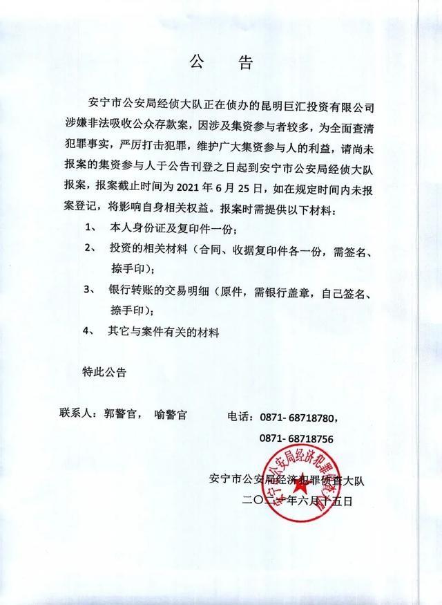 近日,安宁市公安局发布公告,两家公司涉嫌非法吸收公众存款,为全面查清犯罪事实,严厉打击犯罪,维护广大集资参与人的利益,请尚未报案的集资参与人到安宁市公安局经侦大队报案。