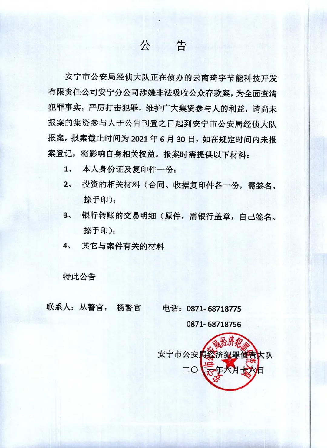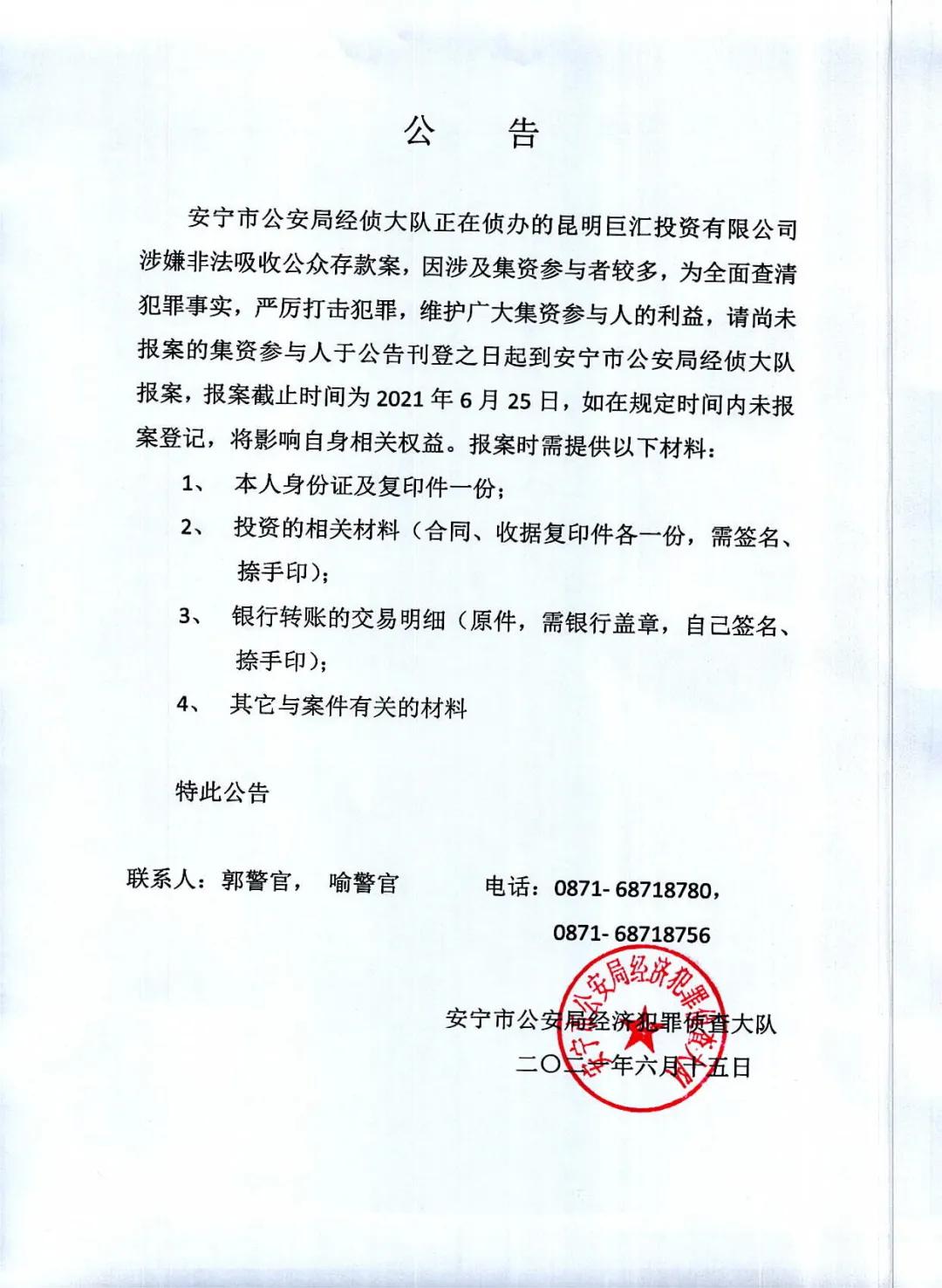 昆明信息港讯 记者合宇聪 6月15日、16日,昆明市安宁市公安局连续发布公告:昆明巨汇投资有限公司及云南琦宇节能科技开发有限责任公司安宁分公司涉嫌非法吸收公众存款,为全面查清犯罪事实,严厉打击犯罪,维护广大集资参与人的利益,请尚未报案的集资参与人到安宁市公安局经侦大队报案。