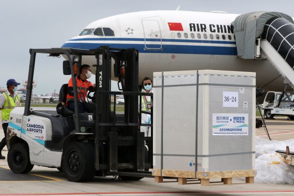6月12日,工作人员在柬埔寨金边机场转移运抵的中国疫苗。(MSN网站)