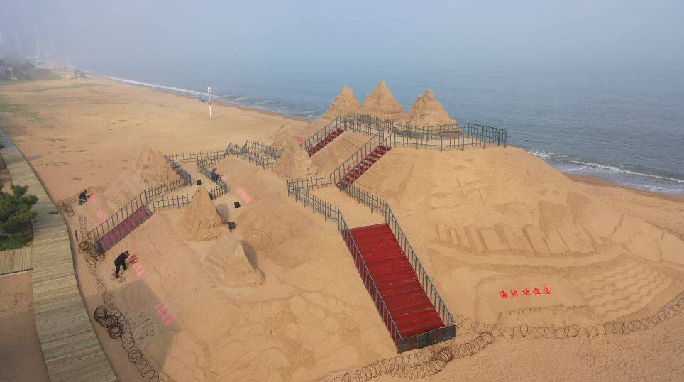 在旅游度假区沙雕公园入口处,沙雕艺术师正在对最后一座引领沙雕进行打造。据了解,本座沙雕是所有沙雕中体量最大、高度最高、耗时最长的一组,用沙量达8000多立方。