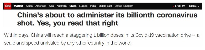 而在6月18日,CNN网站就发表过题为《中国即将进行第10亿次新冠疫苗接种。是的,你没听错》的报道,称中国“惊人的”接种规模和速度是世界上任何其他国家无法比拟的。