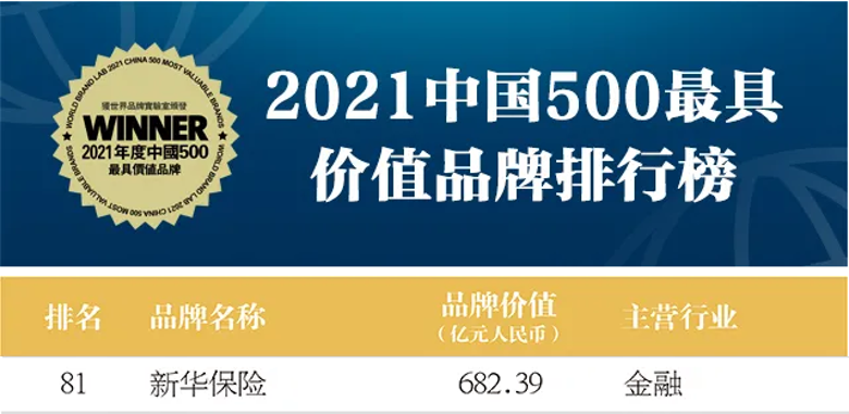 在这份基于财务数据、品牌强度和消费者行为的《中国500最具价值品牌》分析报告中,新华保险品牌价值为682.39亿元,排名第81位。这是新华保险自该榜单诞生起,连续十八年入榜,连续十年居榜单前100名。充分证明了公司在经营发展、品牌建设、可持续发展方面的综合实力。
