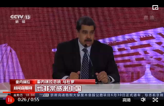委内瑞拉总统 马杜罗:我们敬佩中国,也非常感谢中国,朋友应该同甘苦共患难。在新冠肺炎疫情造成的困难和不确定形势下,中国证明了是委内瑞拉真正的朋友,我们必须要表示感谢,谢谢。