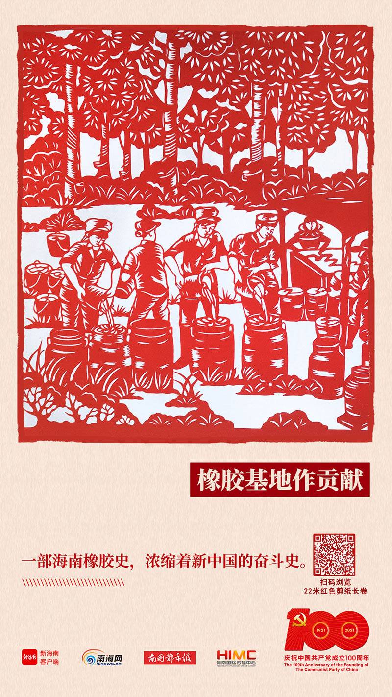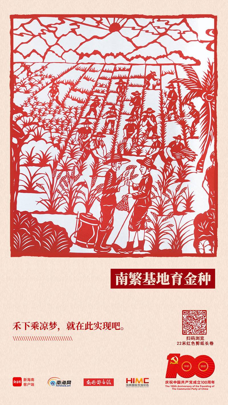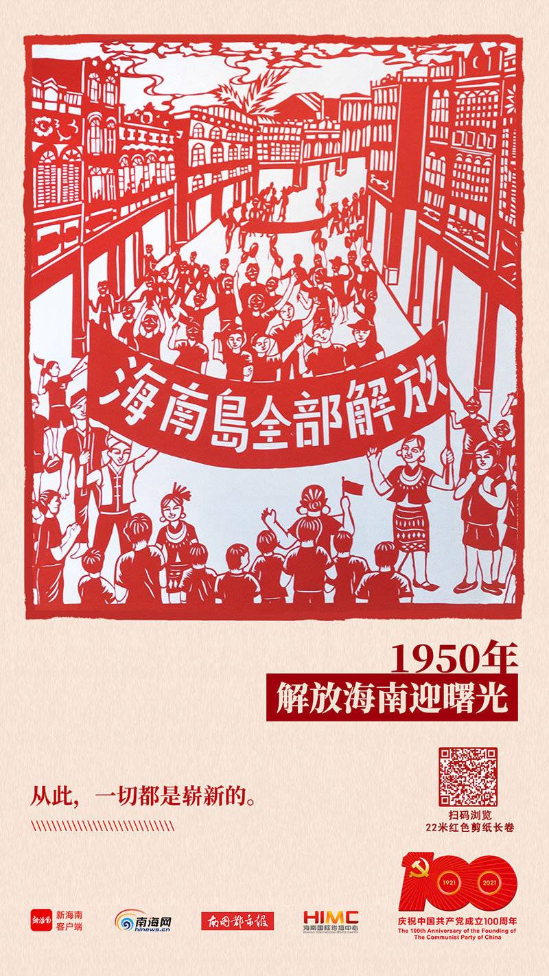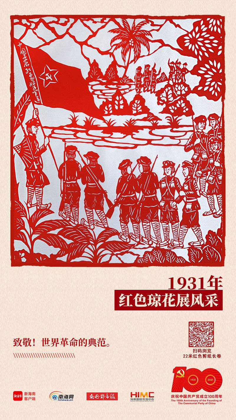 《百年路 海南潮》巨幅剪纸长卷作品由海南国际传播中心、新海南客户端、南海网、南国都市报联合策划推出,邀请海南“南海工匠”黄海桃、韦勤带领的剪纸团队历时一个多月完成。作品长22米,宽68厘米,共21个画面,用非遗艺术生动展现了中共琼崖第一次代表大会、椰子寨战斗打响第一枪、母瑞山革命根据地创建、内洞山会议、解放海南岛战役胜利、建设全球最大自由贸易港等21个重大事件,展现了波澜壮阔的海南百年奋斗史,大气磅礴、令人震撼。