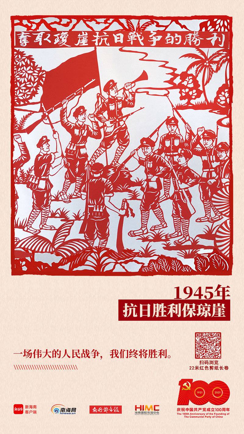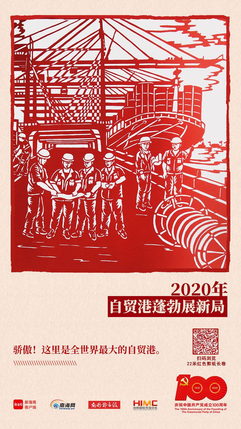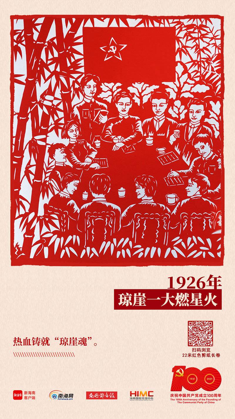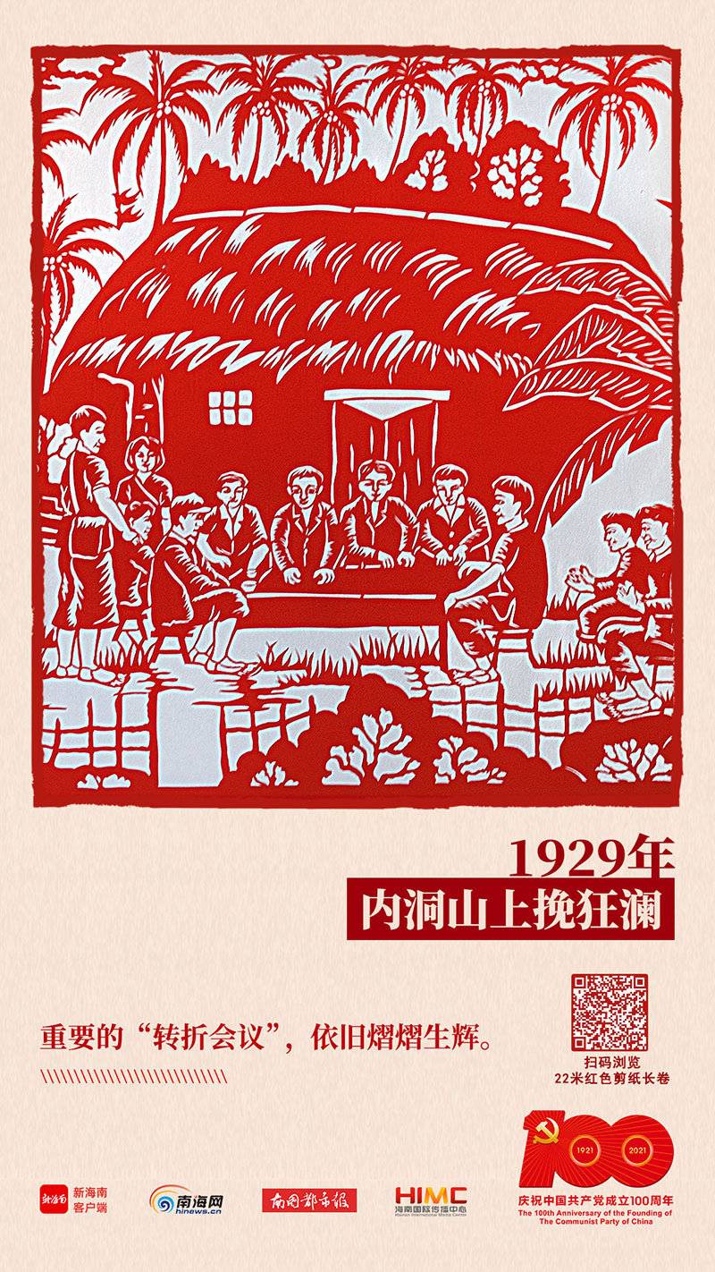 《百年路 海南潮》巨幅剪纸长卷作品由海南国际传播中心、新海南客户端、南海网、南国都市报联合策划推出,邀请海南“南海工匠”黄海桃、韦勤带领的剪纸团队历时一个多月完成。作品长22米,宽68厘米,共21个画面,用非遗艺术生动展现了中共琼崖第一次代表大会、椰子寨战斗打响第一枪、母瑞山革命根据地创建、内洞山会议、解放海南岛战役胜利、建设全球最大自由贸易港等21个重大事件,展现了波澜壮阔的海南百年奋斗史,大气磅礴、令人震撼。