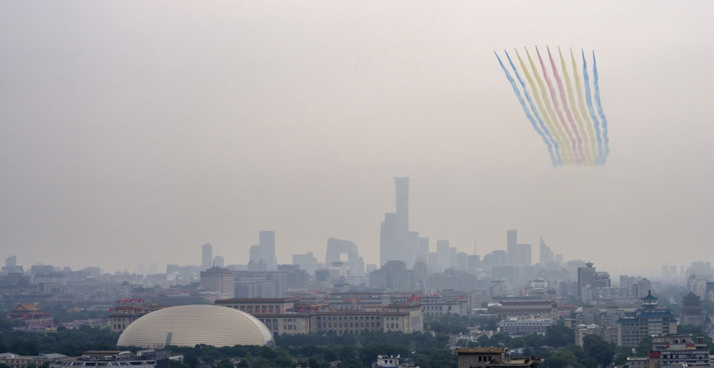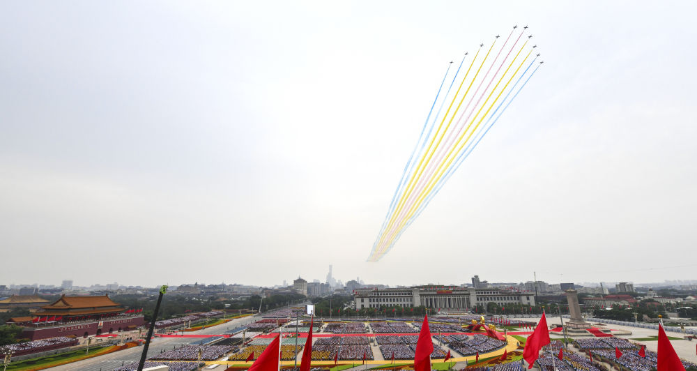 7月1日上午,庆祝中国共产党成立100周年大会在北京天安门广场隆重举行。这是大会开始前的飞行庆祝表演。新华社记者 饶爱民 摄