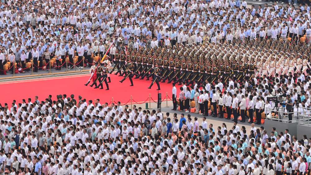 礼炮鸣放是庆祝大会的重要环节,国旗护卫队伴随着100响礼炮声,迈着铿锵有力的步伐,走向升旗区,气氛庄重肃穆。
