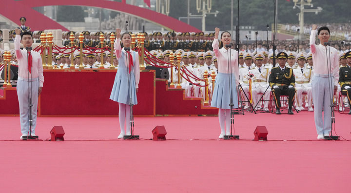 7月1日上午,庆祝中国共产党成立100周年大会在北京天安门广场隆重举行。这是共青团员和少先队员代表集体致献词。新华社记者 陈建力 摄