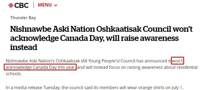 安大略省北部奥什卡蒂亚克原住民社区理事会表示,该机构不承认加拿大国庆日,并选择在7月1日身着橙色服装,以展示该国原住民寄宿学校制度的“可耻历史”以及这段历史残留至今的有害糟粕。
