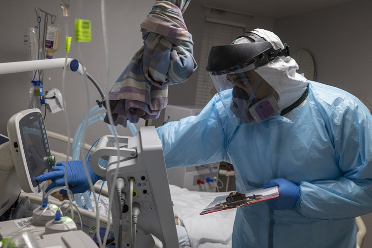 美国得克萨斯州的一家医院内,医务工作者正在照顾一名新冠肺炎确诊患者。(图片来源:人民视觉)