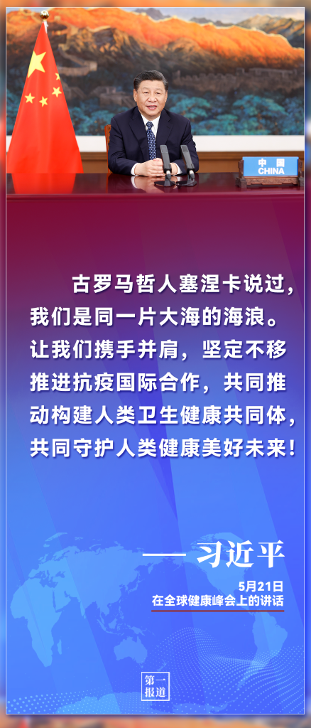 “古罗马哲人塞涅卡说过,我们是同一片大海的海浪。让我们携手并肩,坚定不移推进抗疫国际合作,共同推动构建人类卫生健康共同体,共同守护人类健康美好未来!”习近平主席在全球健康峰会上再次向世界发出了团结抗疫的中国强音。