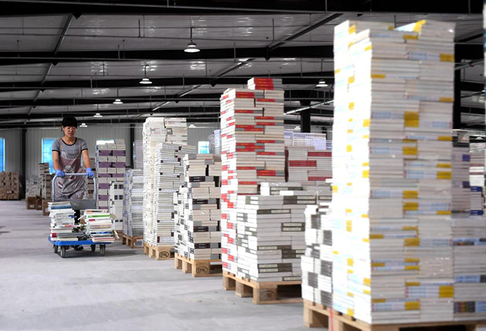7月2日,在永清县三圣口乡一家图书文化企业仓储中心,工作人员在整理图书。