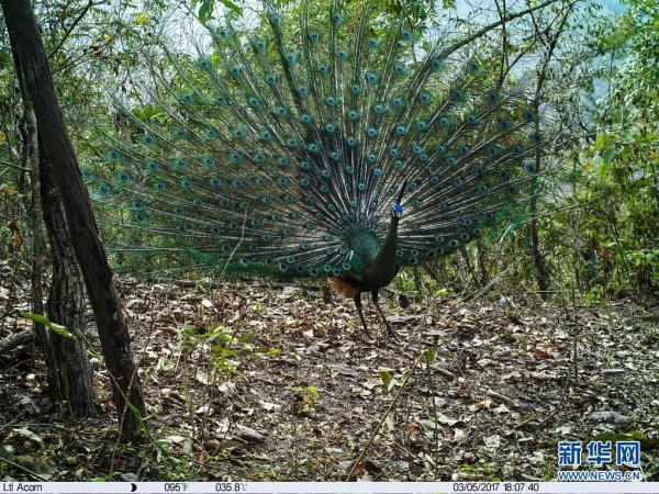 红外相机拍摄到的绿孔雀(资料照片)。新华社发(云南省林业和草原局供图)