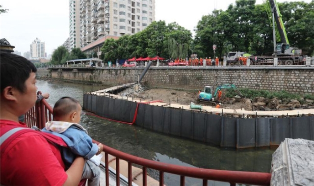 不少市民来到盘龙江边了解江底漏损原水管抢修进度。