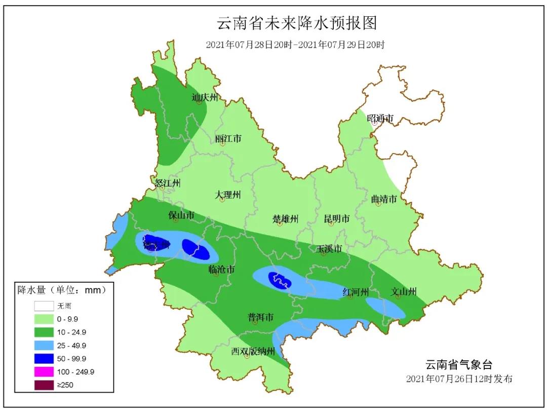 7月26日20时-7月27日20时:迪庆西部、怒江北部、大理南部、保山、德宏、临沧、普洱、西双版纳、玉溪西部、红河南部多云间阴有小到中雨局部大雨,其他地区多云有阵雨局部中雨。