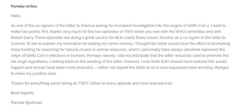 “我也许天真了,没想到这封信会被用来推广实验室起源假说,”比约克曼写道,“回顾这封信的措辞,我现在认为我本应预料到这样的后果。我本应更加积极主动——要么根本不签署这封信,要么要求修改更多措辞以表明我的立场。”