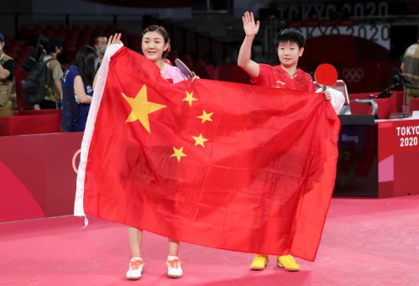 7月29日,陈梦(左)和孙颖莎在比赛后携手共展国旗。新华社记者 王东震 摄