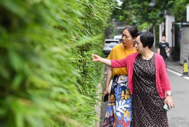林丹(右)和军门社区党委副书记谢榕在社区检查绿化带 新华社记者 林善传 摄