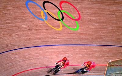 中国队选手鲍珊菊(左)与队友钟天使在场地自行车女子团体竞速赛决赛中。新华社发