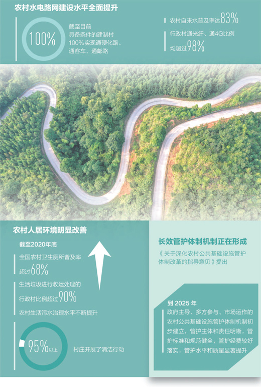 中国人民大学农业与农村发展学院教授孔祥智说,完善乡村基础设施,既要持续改善农村水电路气房讯等传统的基础设施条件,在村覆盖、户延伸上下功夫,也要推进新型基础设施建设,支持农业农村现代化建设。